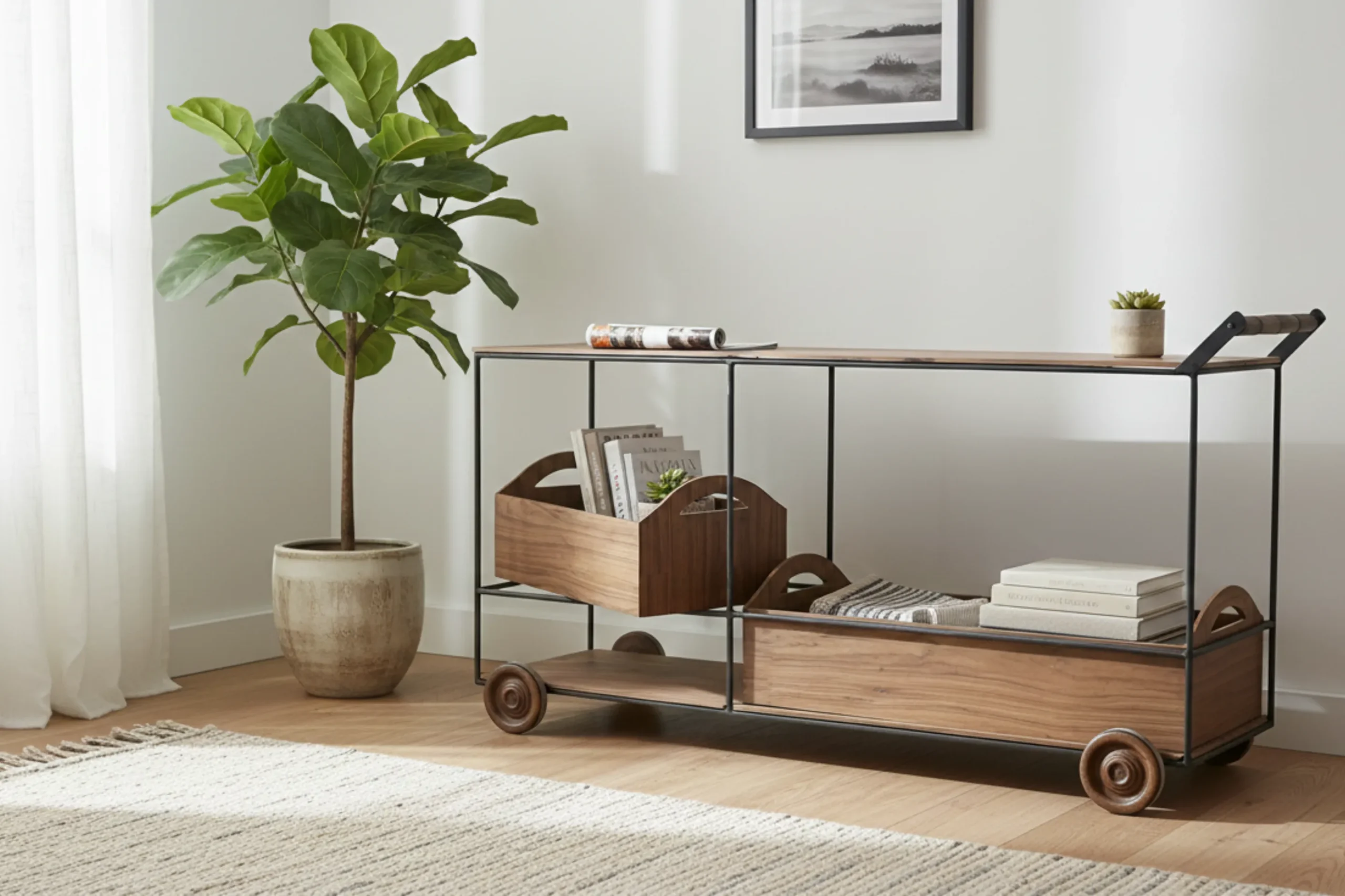 Rolux bar cart features a solid metal steel frame with trays and a bucket in solid wood veneer and smooth wooden wheels for mobility. This stylish piece adds both functionality and sophistication to any room. Rolux’s beauty and design are eye-catching and bring the perfect balance between form, size and function.