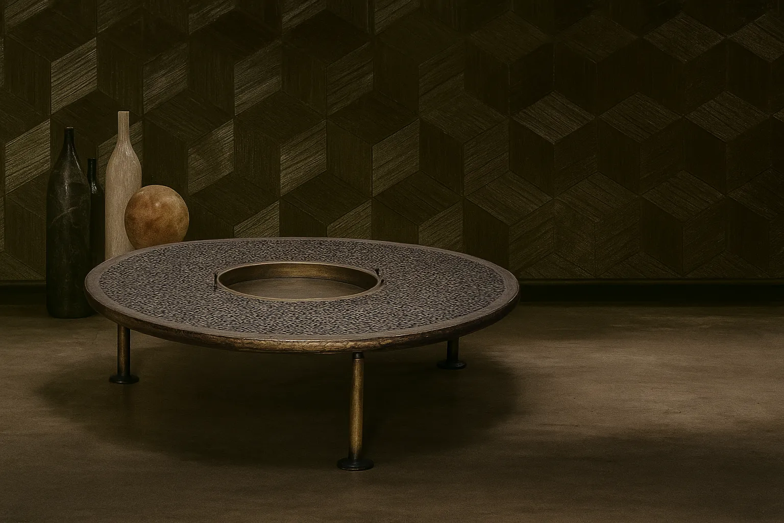 Marble, Walnut Veneer, Copper with Light, Hsira, and Leather